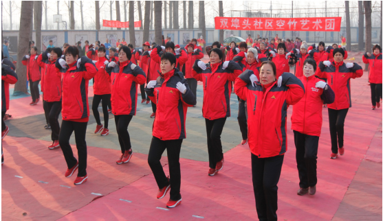 上午9:00,在高亢激昂《运动员入场进行曲》歌声中,文艺汇演拉开了帷幕,活动共有5个队伍参加表演,分别为空竹队、广场舞队、水兵舞队、秧歌队、健步走队,每支队伍各有绝活,其中有的阿姨已经超过七十岁,但没有阻碍她们的舞蹈的追求,反而显得那么的活力四射。